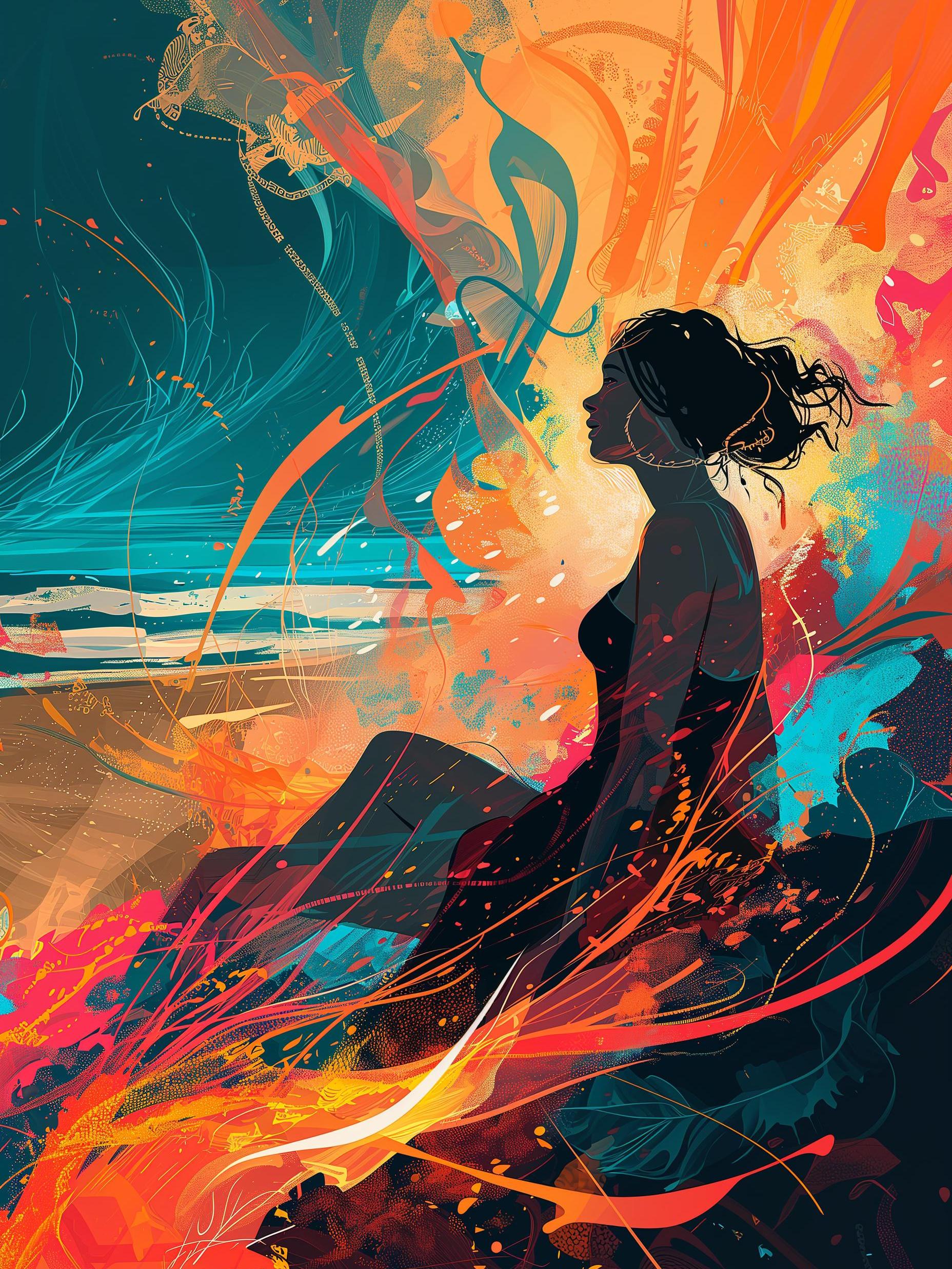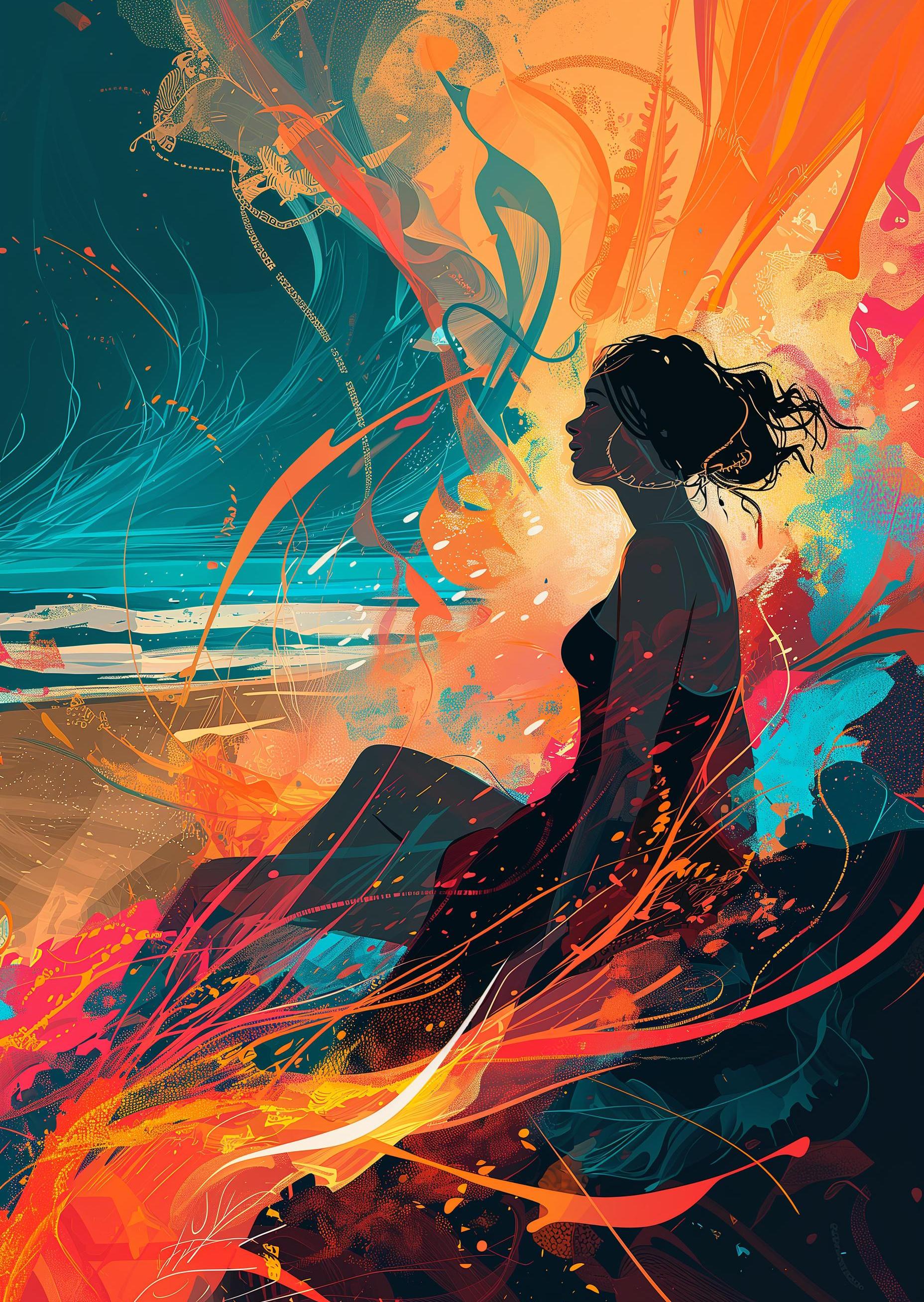 In a burst of color and movement, an artist captures the feeling of raw creativity. Bright oranges and blues dance around a figure lost in thought. She sits, surrounded by a storm of shapes and lines that seem to flow straight from her mind into the world. Each stroke tells of ideas taking flight, a wild mix of emotion and imagination painted into existence. This vivid display shows the power in human emotion and the beauty of letting thoughts run free.