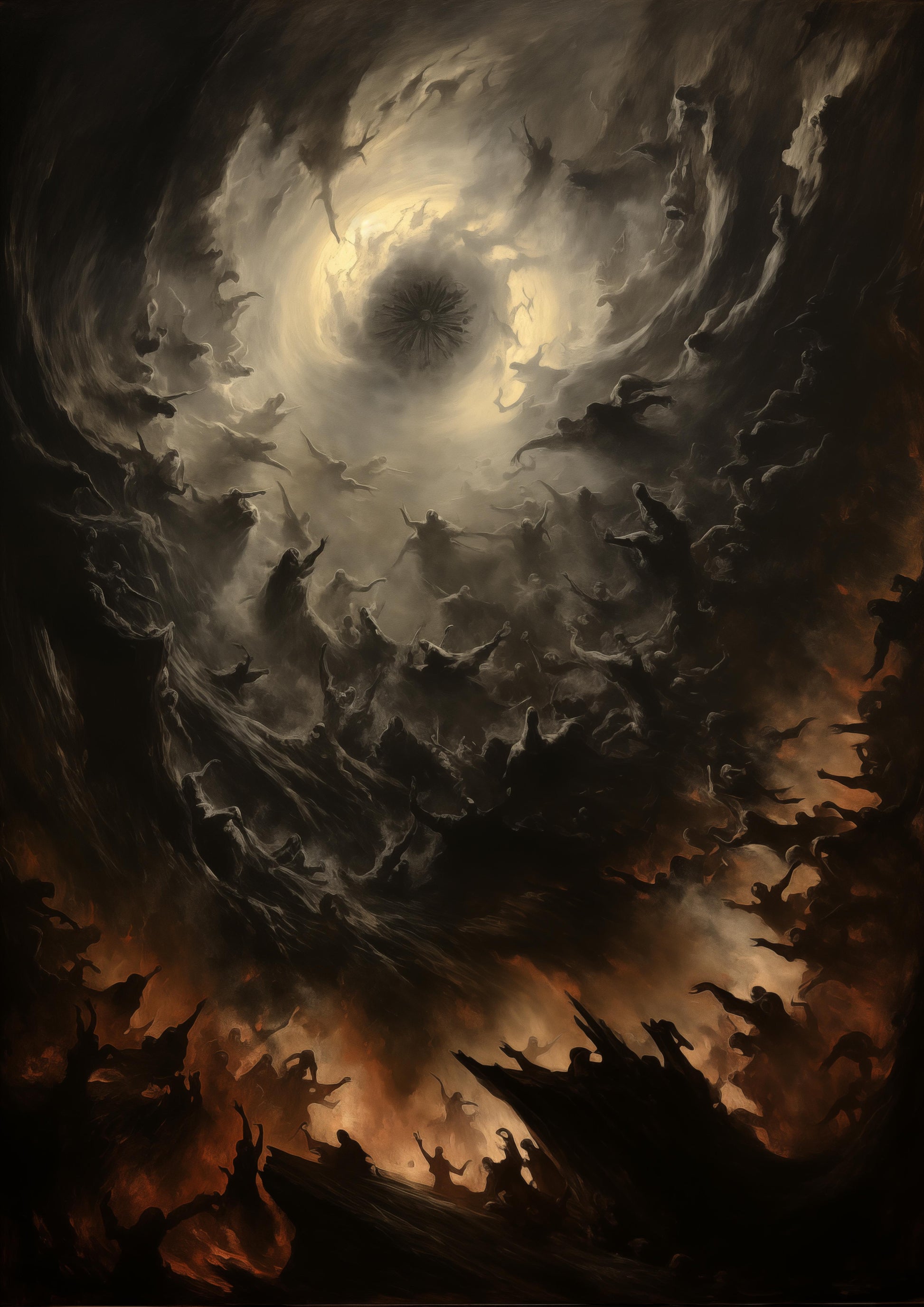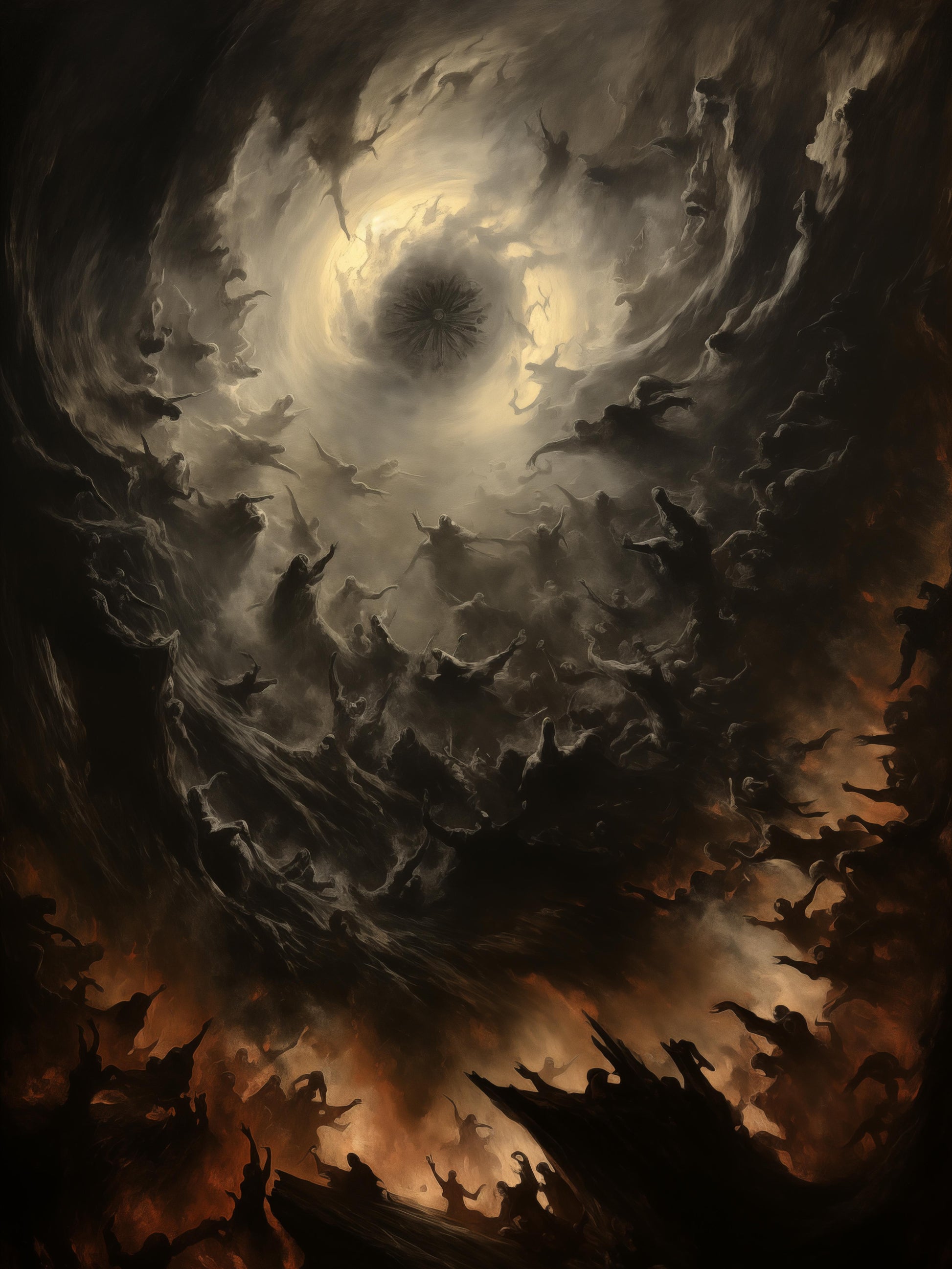 In a realm where day and night no longer exist, a vortex of souls swirls under a somber glow, casting a spectacle of grim awe. The fiery abyss below rages with energy, as figures are pulled into the spiraling dance, their fate sealed by the mysterious dark orb overseeing the chaos. This mesmerizing yet daunting event, more like a cosmic dance of lost spirits, unfolds with a relentless intensity, captivating and frightening to any onlooker daring enough to witness the spectacle. The convergence of light and darkness creates a powerful contrast, highlighting the unstoppable force of nature's profound and unstoppable phenomena.