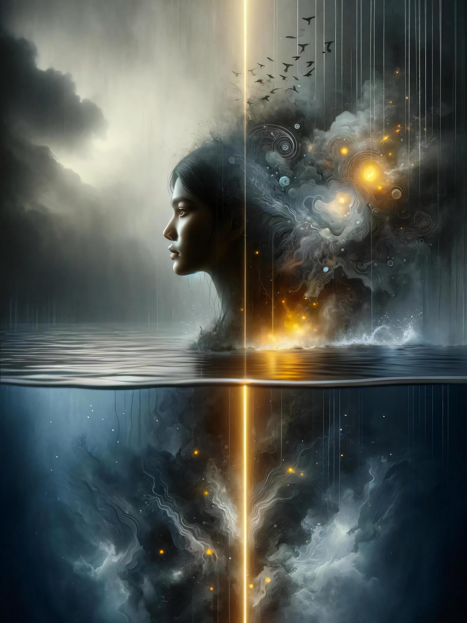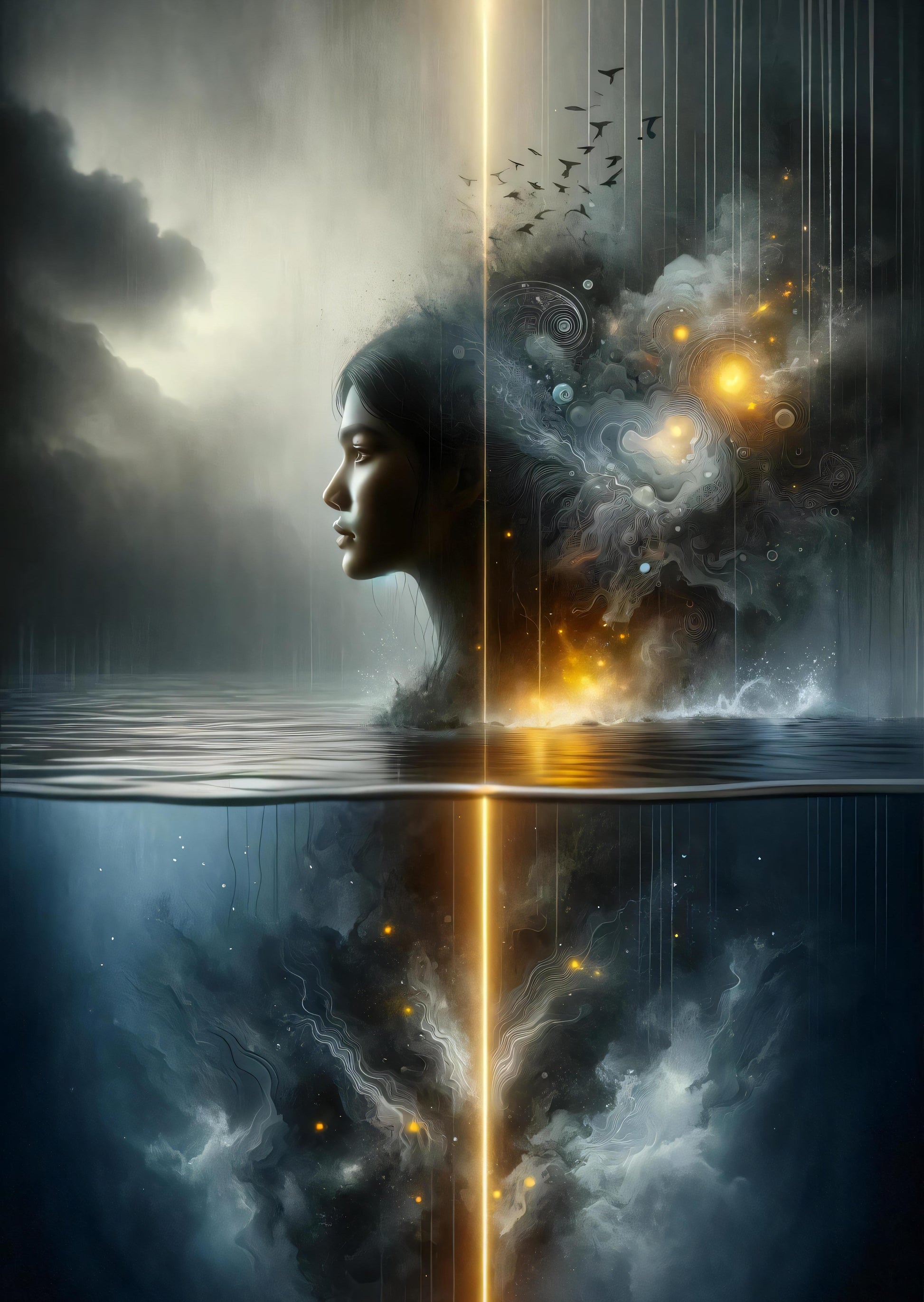 This captivating poster presents a female subject immersed in a realm where the subconscious meets the waking world. A luminous divide bisects the scene, symbolizing the thresholds of human consciousness. Above and below the water's mirror-like surface, abstract elements and avian forms ascend, reflecting the inner workings of thought and emotion. Stark contrasts of light and dark evoke the profundity of the mind's landscape, a visual representation of psychological dichotomies. The interplay between the ephemeral and the corporeal suggests an exploration of individual introspection and the complex layers of human cognition. This artwork invites viewers into a meditative contemplation of the psyche's depth and the boundless potential for discovery within oneself.