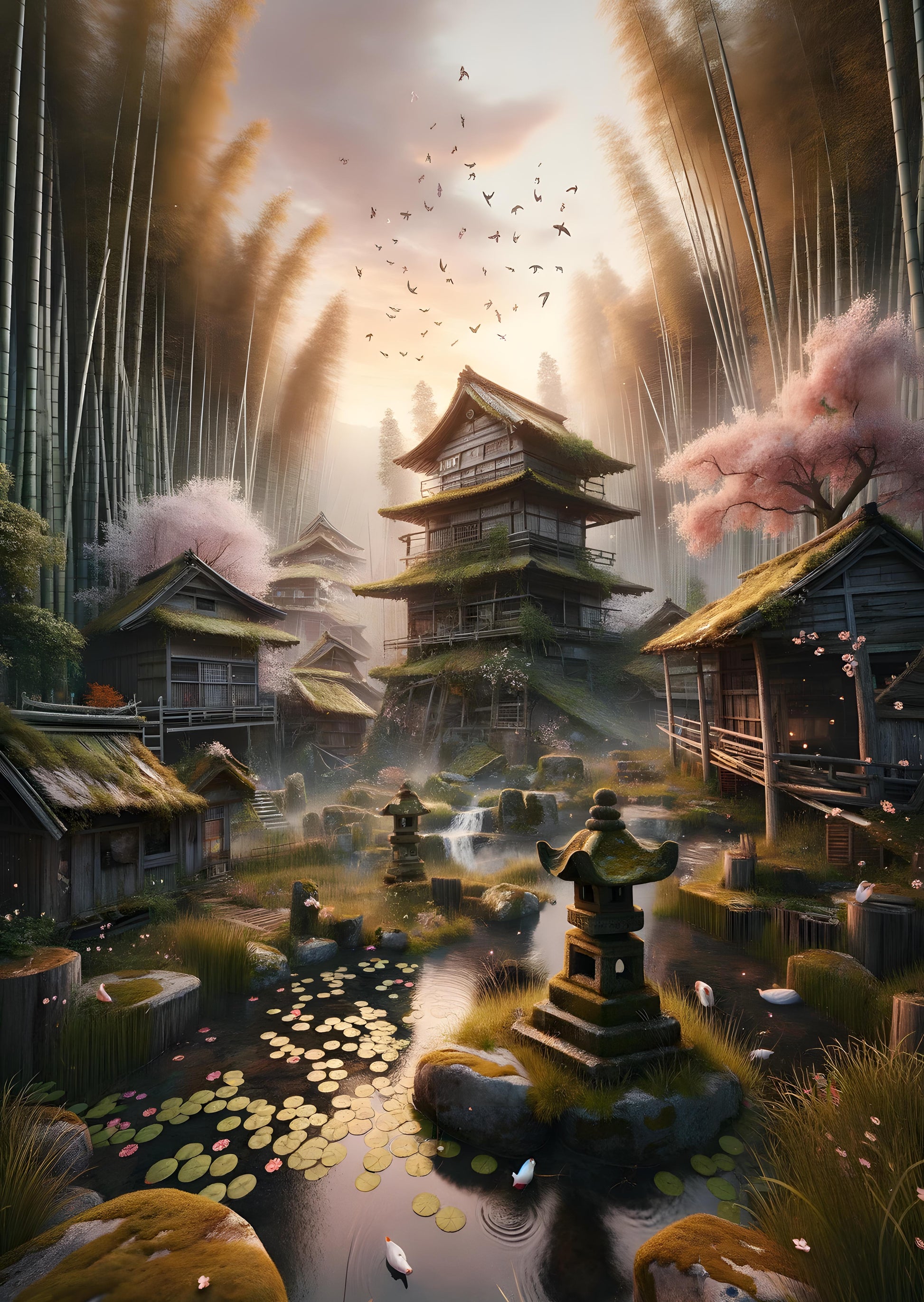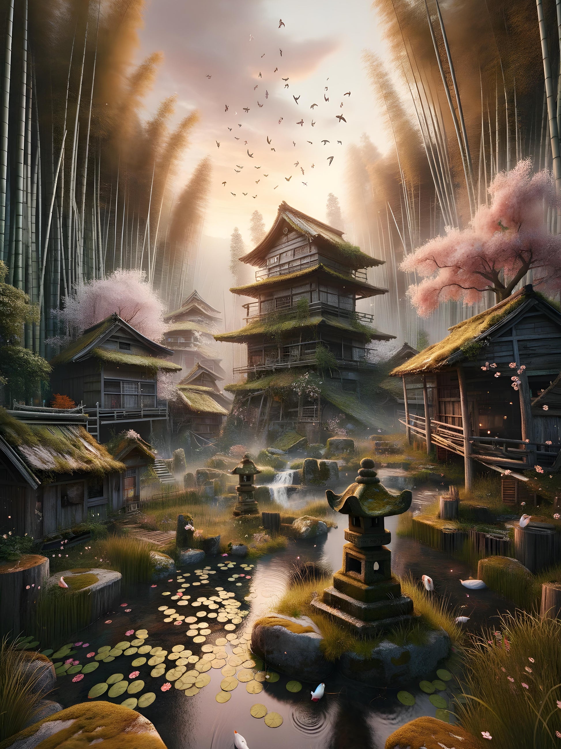 In a village where the fusion of nature and human craftsmanship is a testament to its inhabitants' reverence for their surroundings, ancient timber houses rise like timeless guardians amid the tall, whispering bamboo. As the day wanes, the golden light kisses the flourishing landscape, and petals from cherry blossoms dance with the misty breath of cascading waterfalls. Beneath, a pond mirrors the dance of koi, their movements as fluid as the floating lily pads dotting the water's surface. Overhead, birds take flight in a synchronized ballet, their wings painting shadows on the sunward faces of the homes, casting the village in a dreamscape where the passage of time seems to pause, inviting all who wander here to share a moment of reflection amidst the beauty.