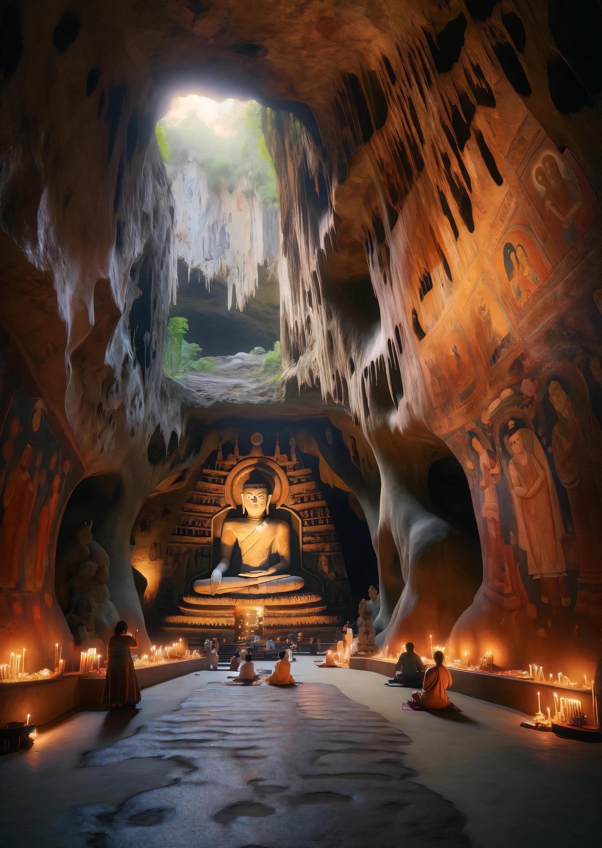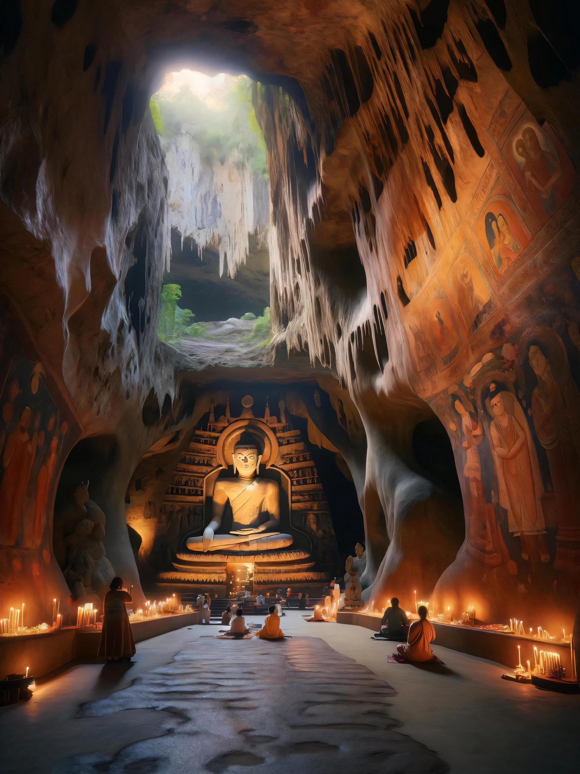 Explore the spiritual depths of a centuries-old Buddhist cave sanctuary where an imposing statue of the enlightened Buddha sits in meditative poise, enveloped by the natural grandeur of stalactites and majestic rock formations. Illuminated by the soft glow of candles, the cave walls come alive with vivid frescoes depicting tales of wisdom and compassion. Monks in saffron robes blend into the calm, their silent contemplation a testament to the enduring pursuit of inner peace. This sanctuary serves as a confluence of nature's artistry and human devotion, inviting you on a journey through the rich heritage of Buddhism—a timeless quest for understanding and awakening.