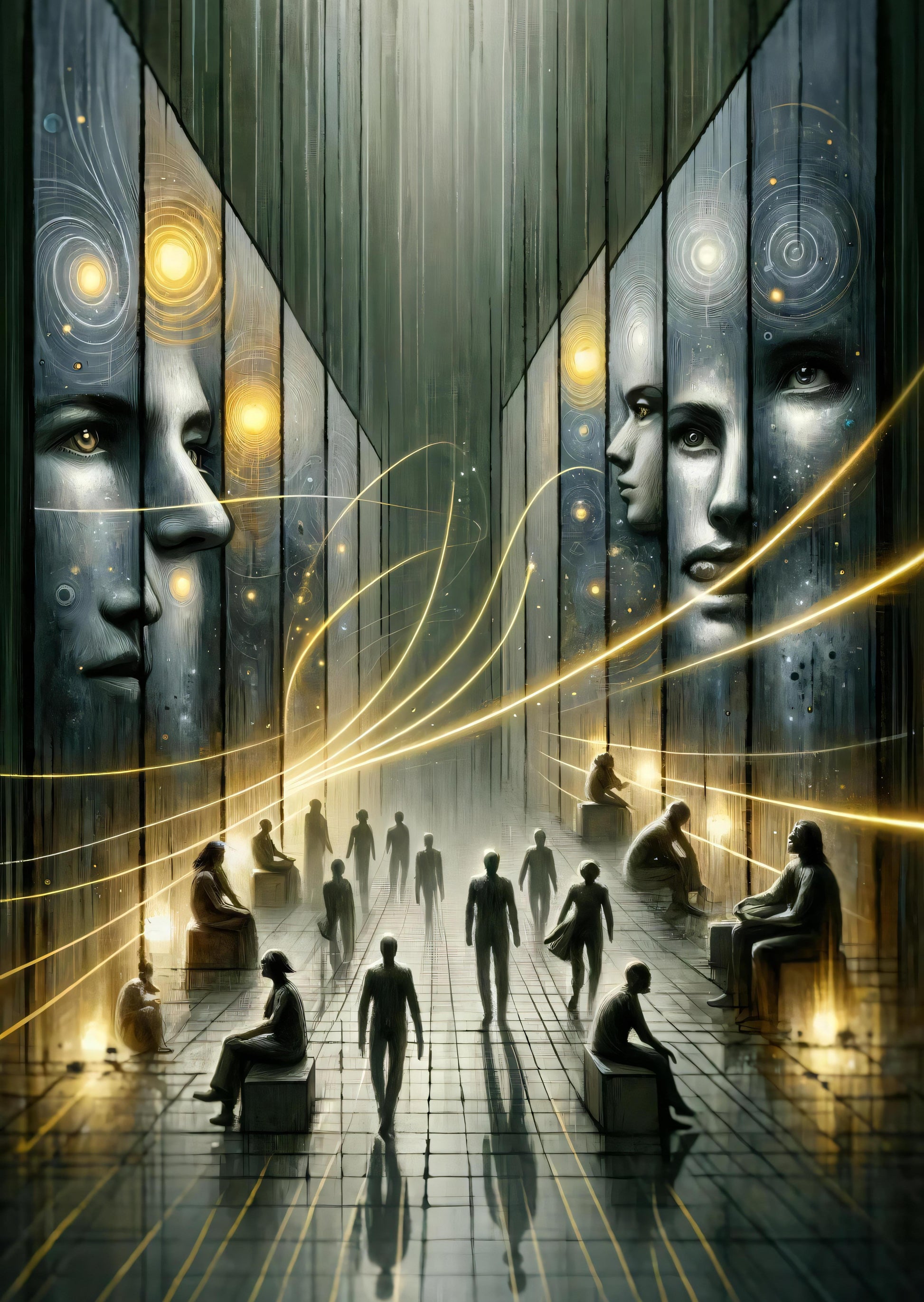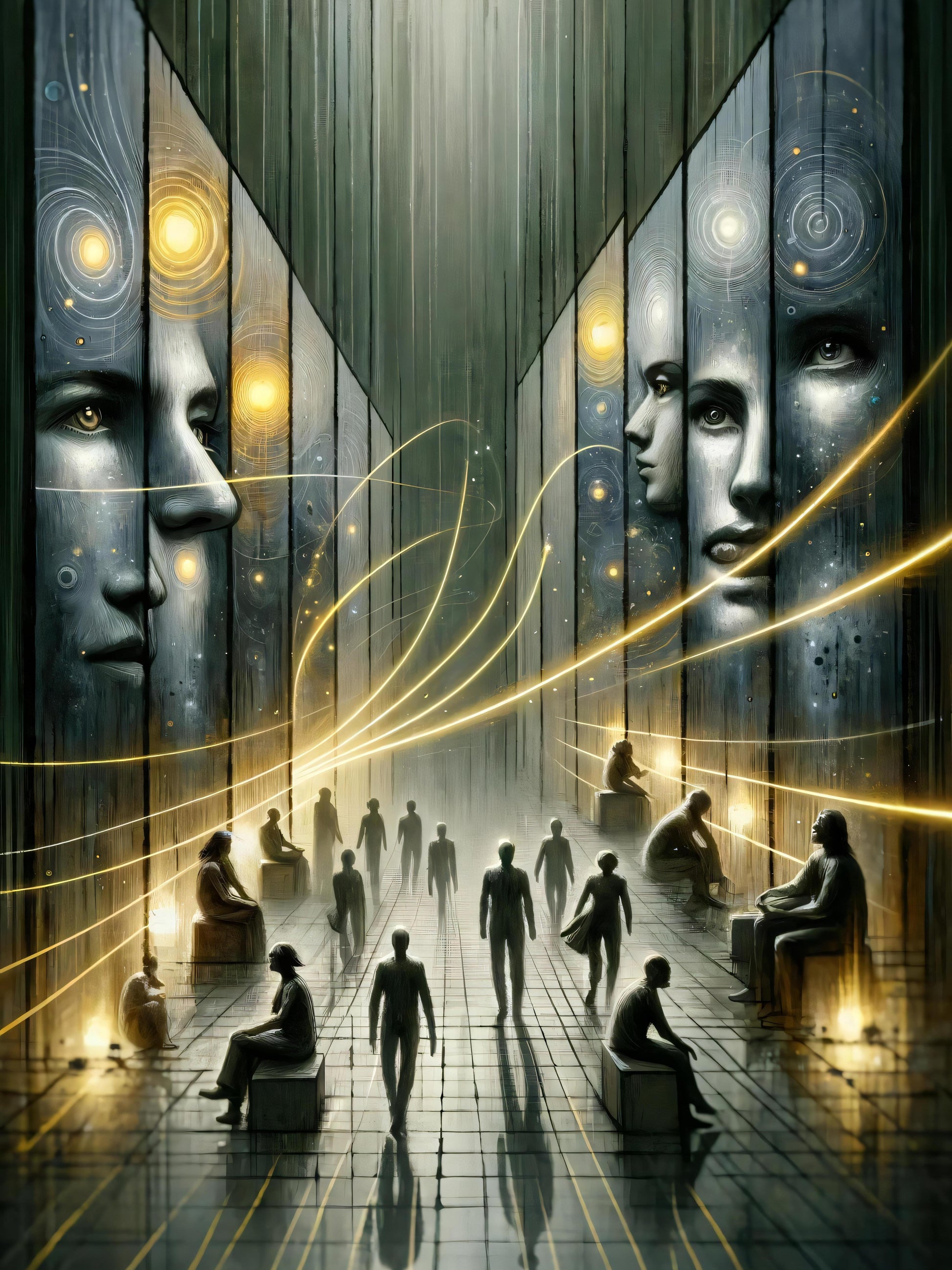 Venture into the depths of the psyche in this visually captivating poster, where human consciousness emerges as multifaceted faces etched onto towering walls. These larger-than-life visages, adorned with intricate celestial patterns, stand guard over the dimly lit thoroughfare, suggesting an exploration of the Jungian collective unconscious. Figures wander and sit in contemplation amidst the glow of ambient lights, their shadows stretching out, hinting at the multifarious nature of personal and shared identities. Streams of luminescence weave through this metaphysical corridor, metaphorically illuminating paths of thought, insight, and perhaps, the interconnectedness of minds. This artwork serves as an intricate map of human introspection and interconnected thoughts, inviting observers to reflect on the complex layers that compose our inner selves and the shared human experience.