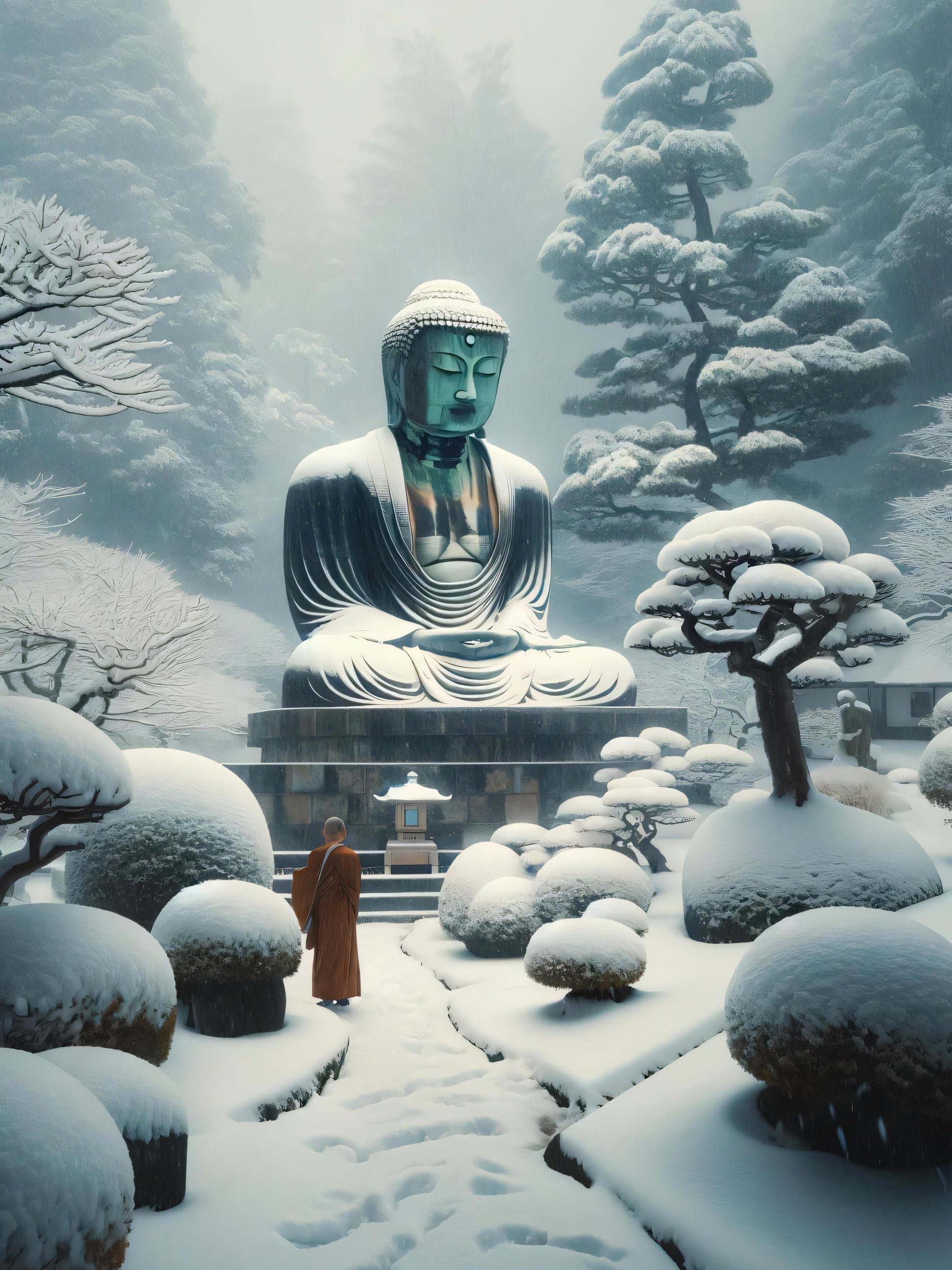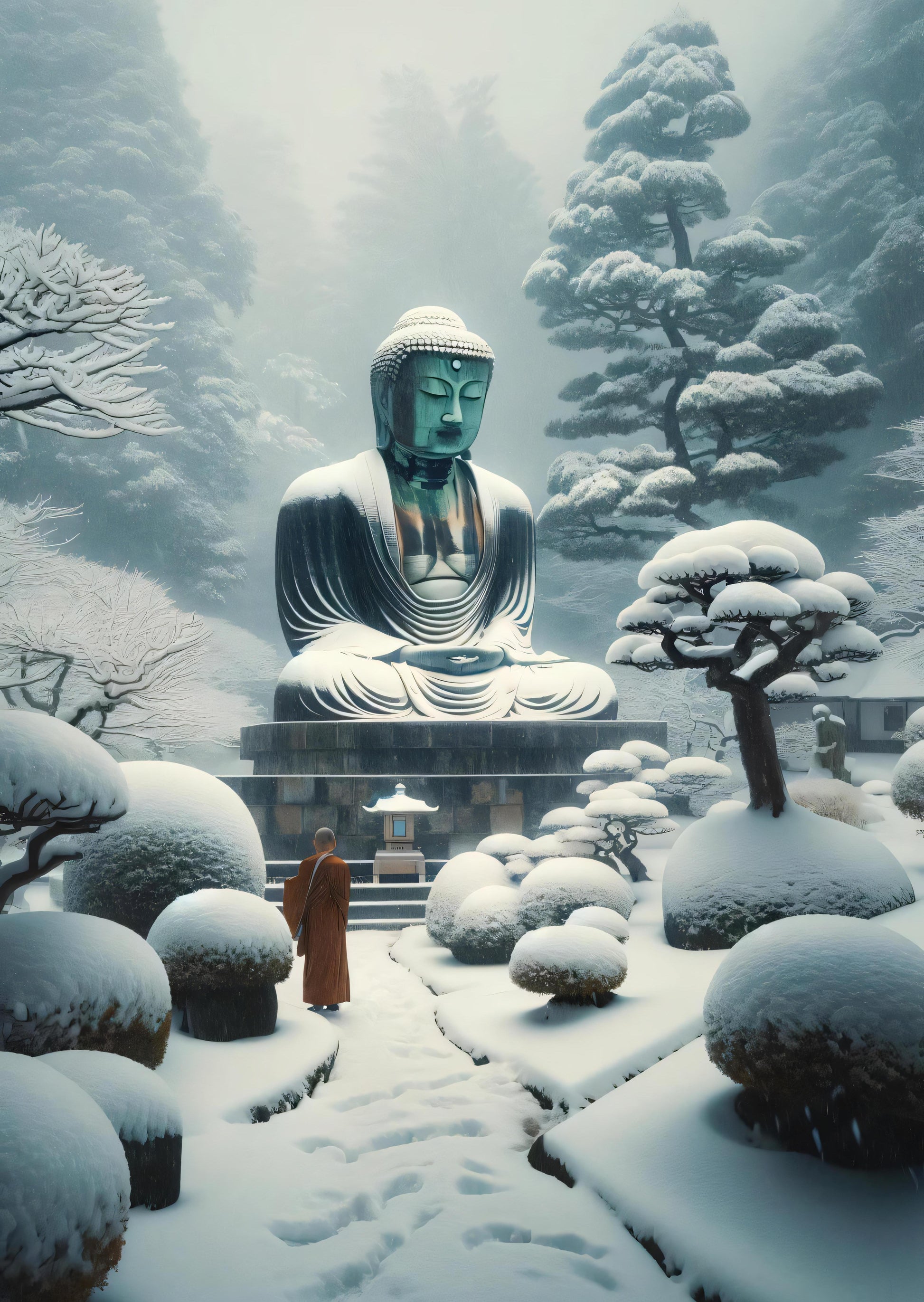 In a snowy garden, a giant statue sits still among the trees, clothed in winter white. A single figure approaches, steps careful, leaving a path in the soft snow. The scene, shrouded in a silent cold, speaks to the heart about the quiet power of stillness. The figure, wrapped in a warm cloak, seems small against the grand statue but holds a calm presence. This moment captures life's delicate balance: nature's vastness and human contemplation. It hints that peace is not just found in the absence of noise, but in the acceptance of the world's immense beauty and size compared to our own existence.