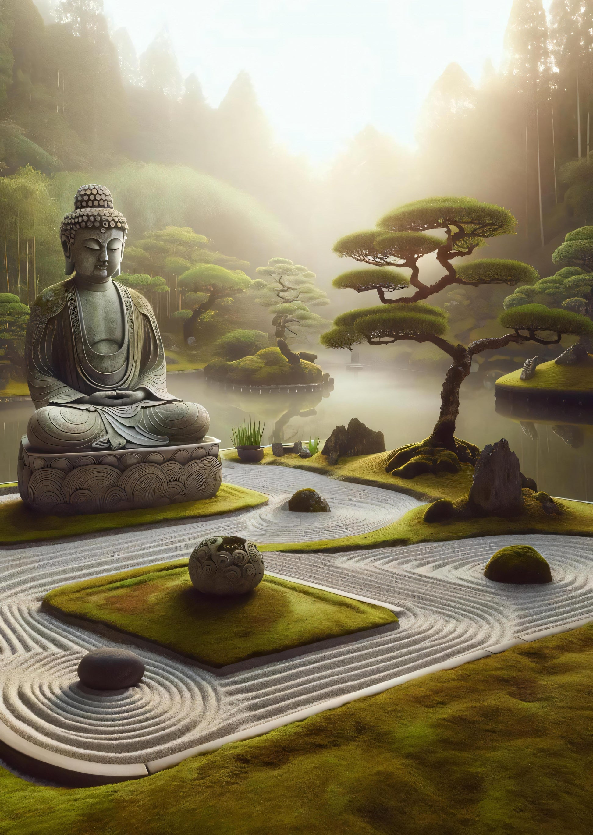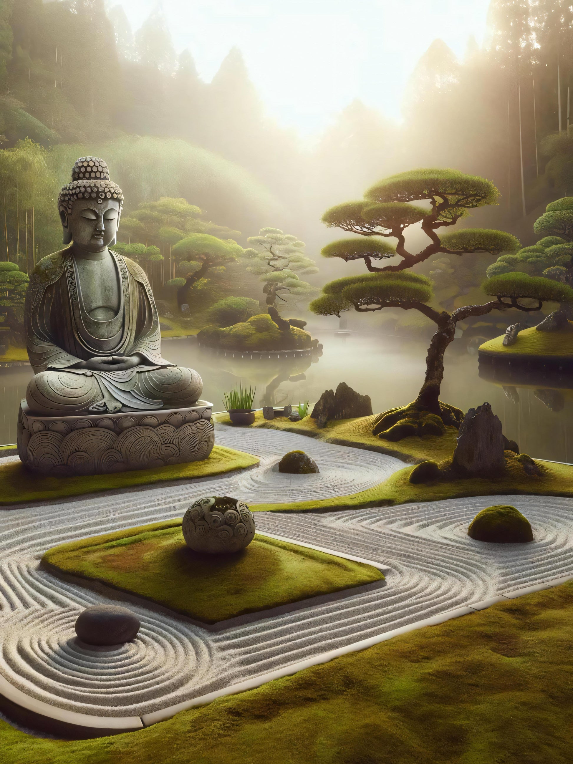 In a peaceful garden, a great stone figure sits, its face calm, overlooking a clear pond and beautiful green trees. It reminds us that in the midst of nature’s quiet beauty, we can find a moment to pause and breathe. The neatly raked sand creates patterns that lead the eye and mind to wander, inviting thoughts to flow smoothly without rush. The mossy rocks stand firm, as if they're ancient guardians of this tranquil haven. The misty light filters through the air, promising that every new day brings a fresh chance to start again. Here, in this place, the world seems to hold its breath, allowing space for reflection and inner peace.