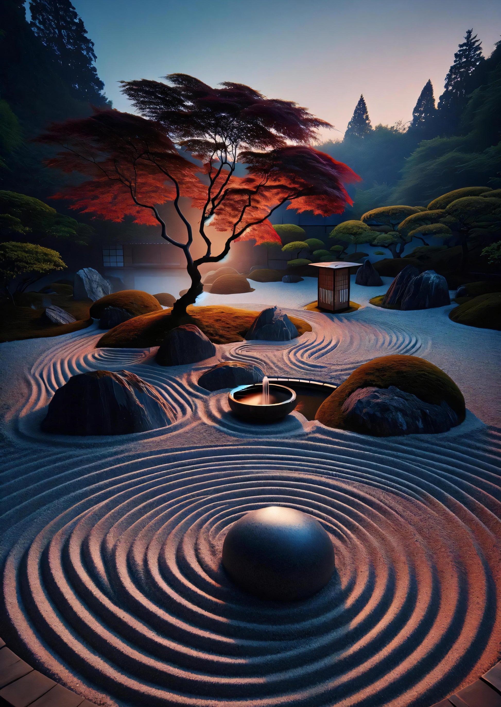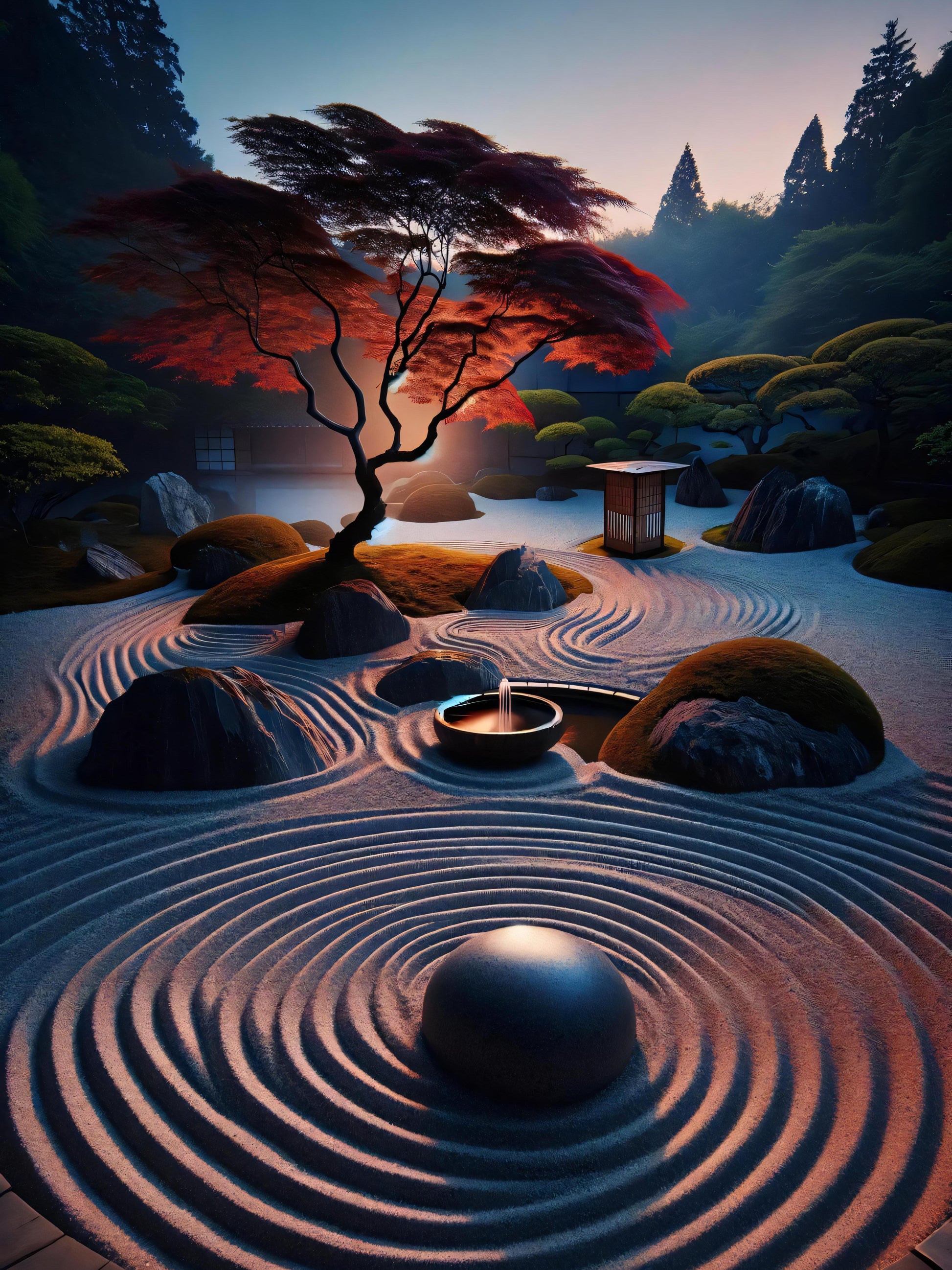 In a garden where the red-leaved tree stands tall and the water calmly flows, there sits a sphere of stone, the centerpiece of this tranquil domain. Each ripple in the sand around it tells a tale of time and thought, carefully crafted by gentle hands. There's a bridge, small yet sturdy, inviting souls to cross over gently moving waters. A traditional lantern illuminates the path, suggesting that even as daylight fades, there will be light to guide one's steps. As the cool air softly moves through the space, the garden seems to breathe, a living testament to nature's quiet beauty and the careful art of human touch. This place, simple and still, highlights the importance of balance between nature and nurture, stillness and life.