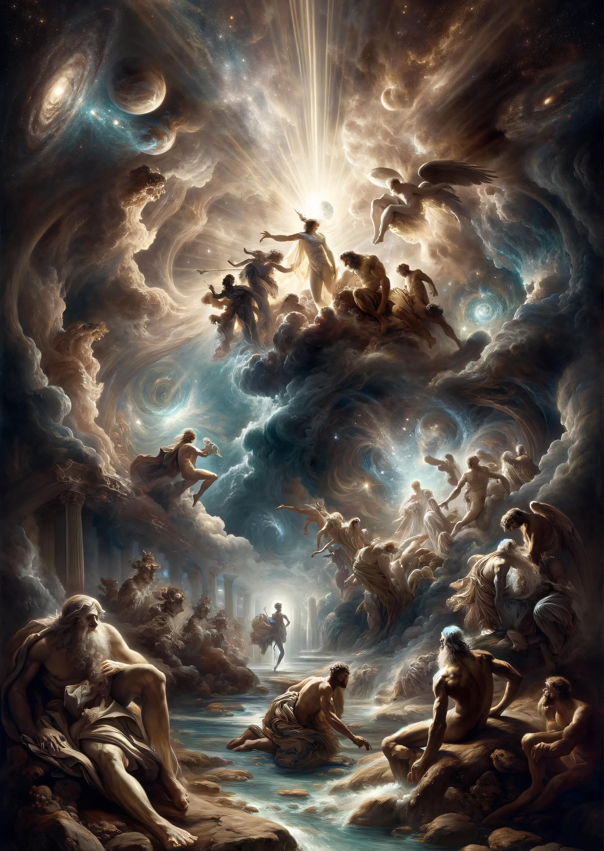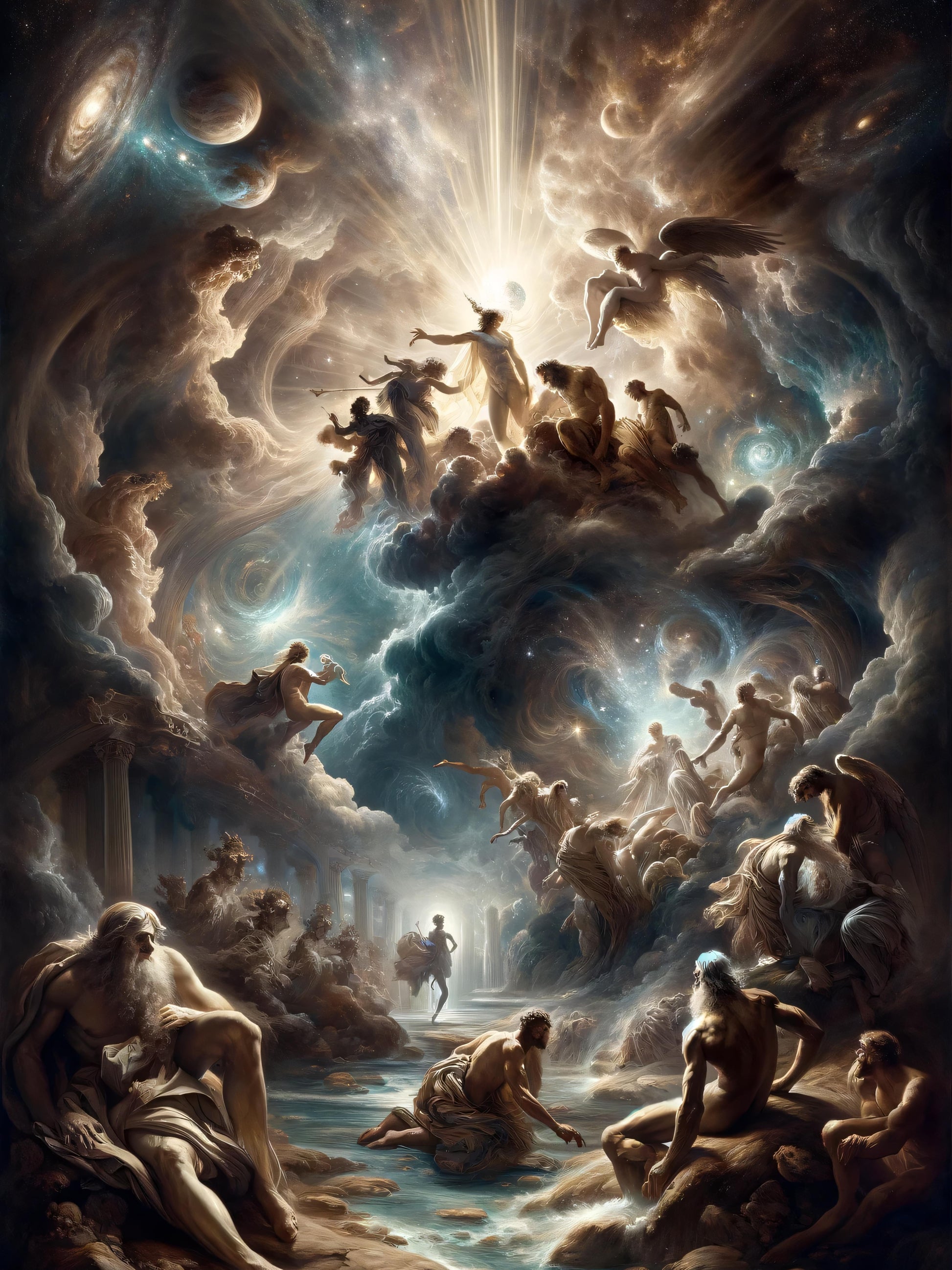Behold the divine convergence of celestial entities in an ethereal dance amongst the cosmos, as Olympian gods converge within swirls of stellar nebulae. At the epicenter, Zeus, the god of sky and thunder, is aglow with the power that rules over gods and men alike in ancient Greek mythology. Figures of might and grace surround him, evoking tales of heroism and legend in a swirling vortex that bridges the heavens and earth. Witness a pantheon of immortals, where the boundaries of time and space are transcended, each character etched with the legacy of myth, their narratives entwined with the history of a civilization forever fascinated with the exploits of the divine.