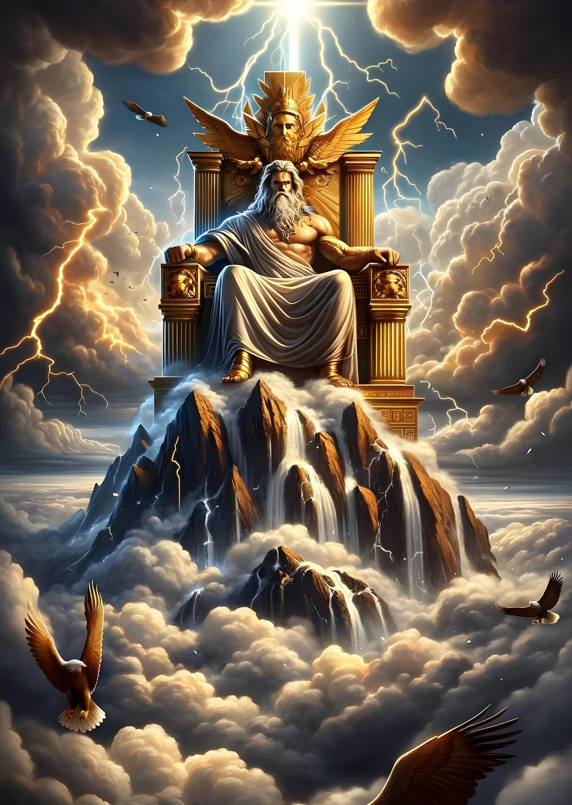 Behold the mighty Zeus, ruler of Mount Olympus, and king of gods and men Seated majestically upon his golden throne atop a rugged mountain, he oversees the mortal and divine realms His gaze is as powerful as the storm clouds that surround him Bolts of lightning serve as a testament to his control over the skies and his formidable power Eagles, his sacred animal, glide through the turbulent air echoing his supremacy and freedom Zeus, the ancient Greek god of the sky and thunder, is depicted in all his glory This artwork captures the essence of Zeus' dominion, a sight both awe-inspiring and humbling Witness mythology come to life in this stunning display of sovereignty and divinity.